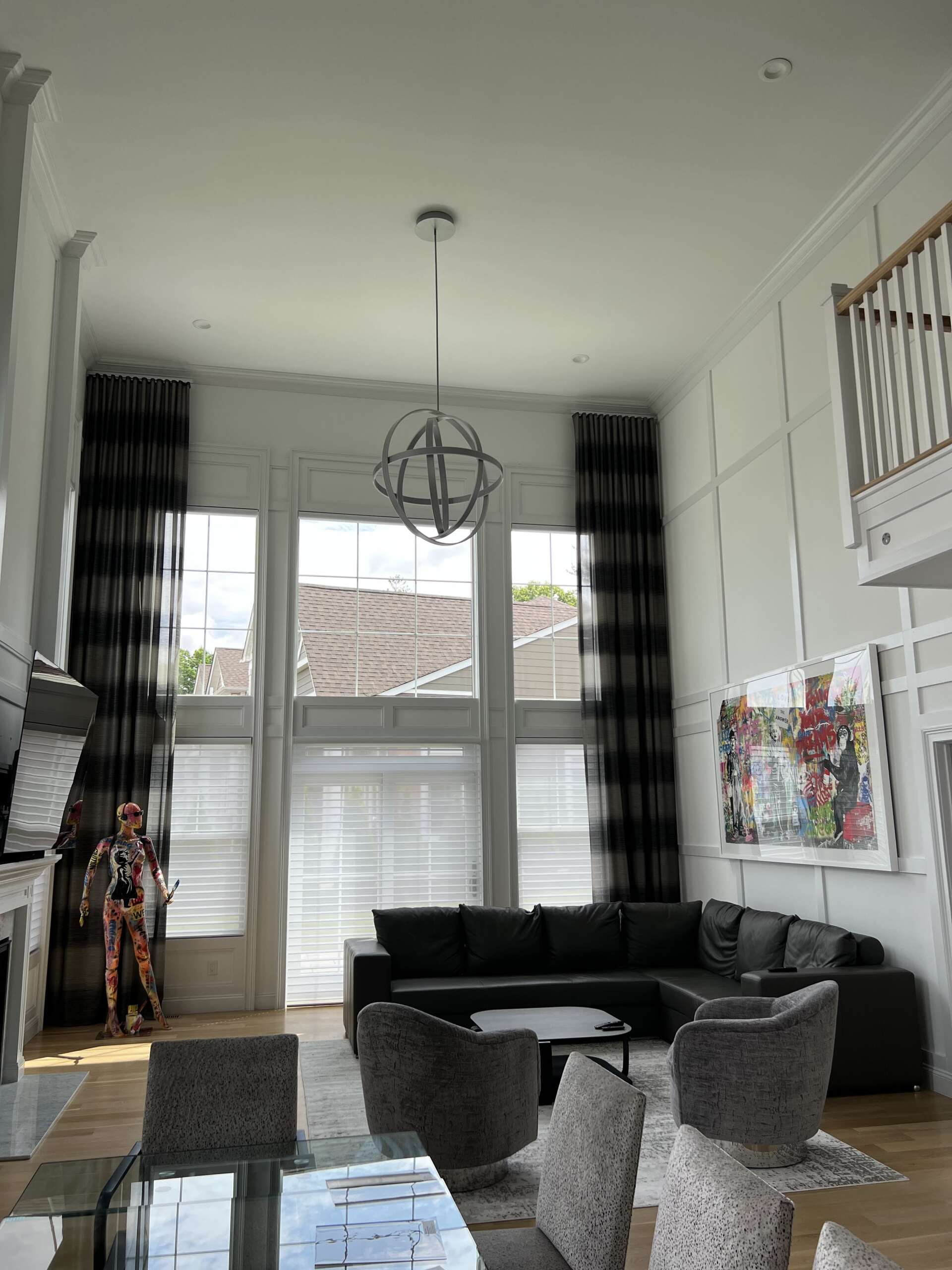 B E A U T I F U L…… swipe to see the awesome decor throughout this grand room🔥 Hunter Douglas PowerView Silhouettes & Custom Drapery Panels. This designer knows what she’s doing👍🏻