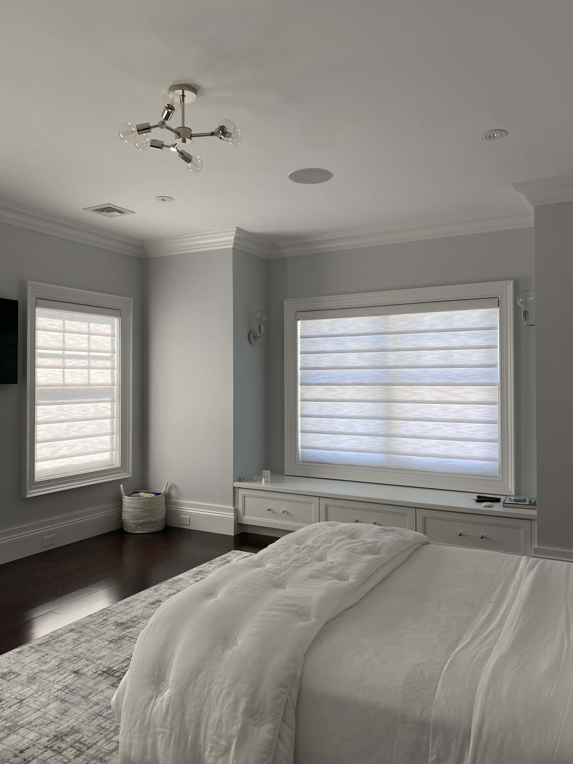 Beautiful House. Beautiful choice in shades. Hunter Douglas Motorized Silhouettes. For those that love the diffused view! Master Bathroom features a Cellular top down bottom up shade with a cool textured fabric🔥Home owner has great taste @daniellerose7