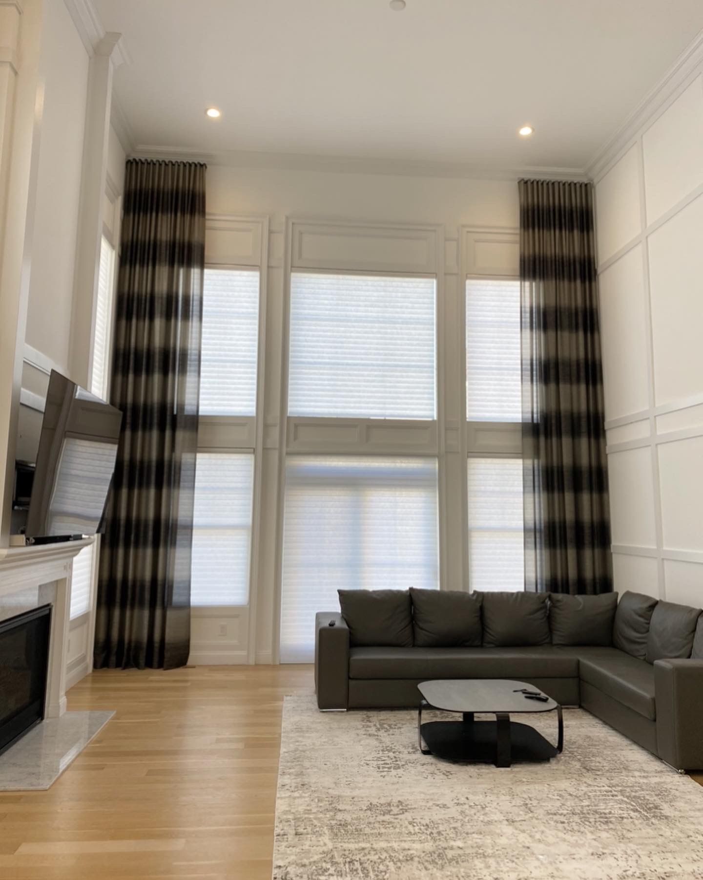 This was a fun one to watch come along! Big credit to @karinkrinsky for the design. Hunter Douglas PowerView Silhouettes and Ceiling to floor stationary panels. Finish Product speaks for itself!