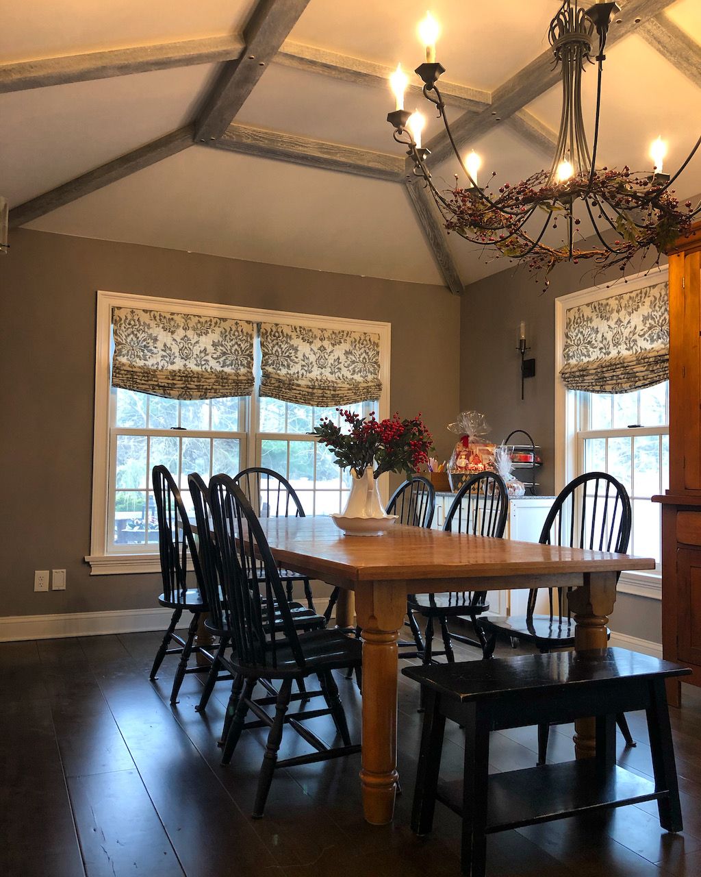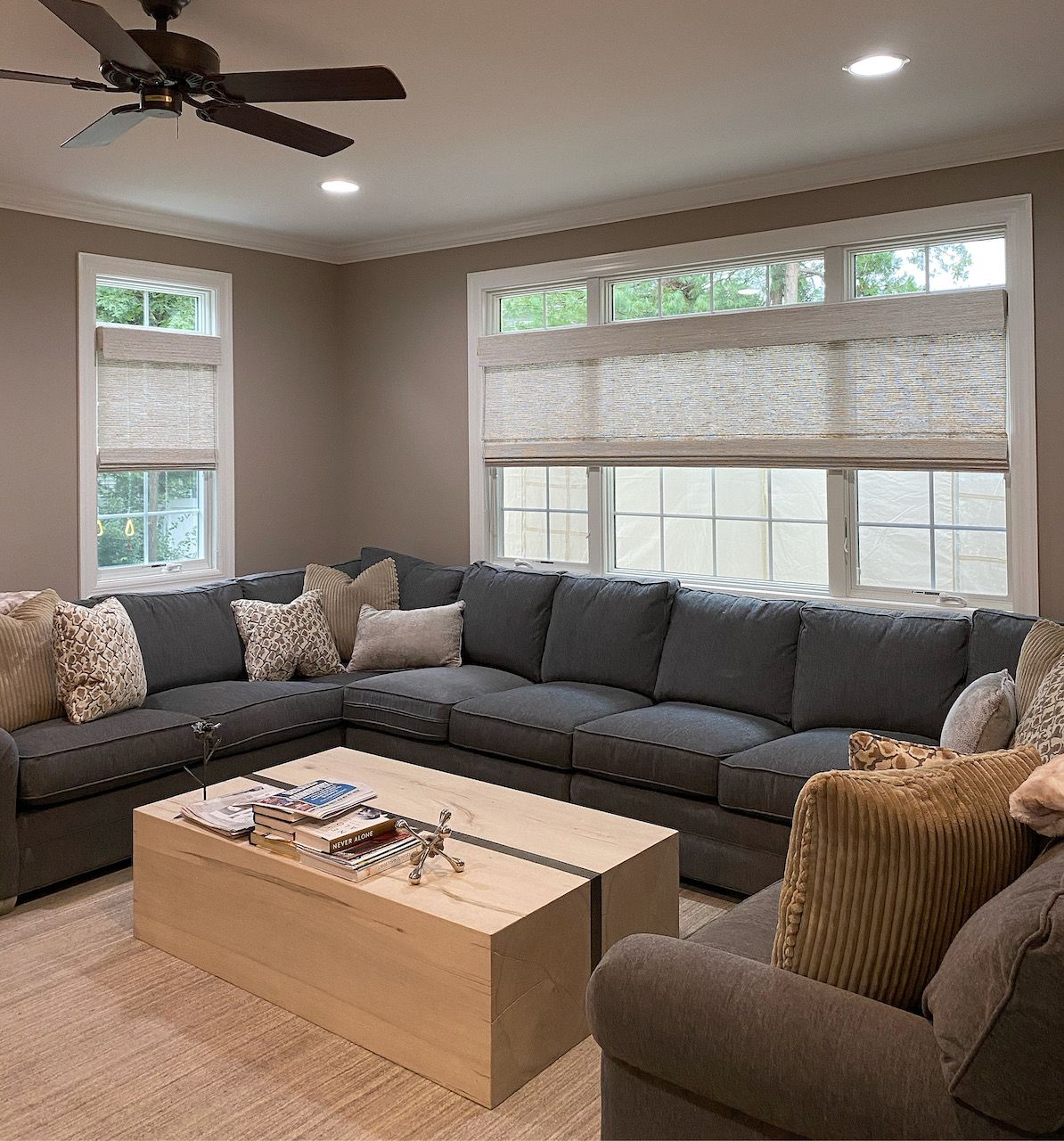 Perfect finishing touch to this great room. Still show the transom windows yet give privacy and style to the room. Decorative cordless roller shade w/Classic Valance
